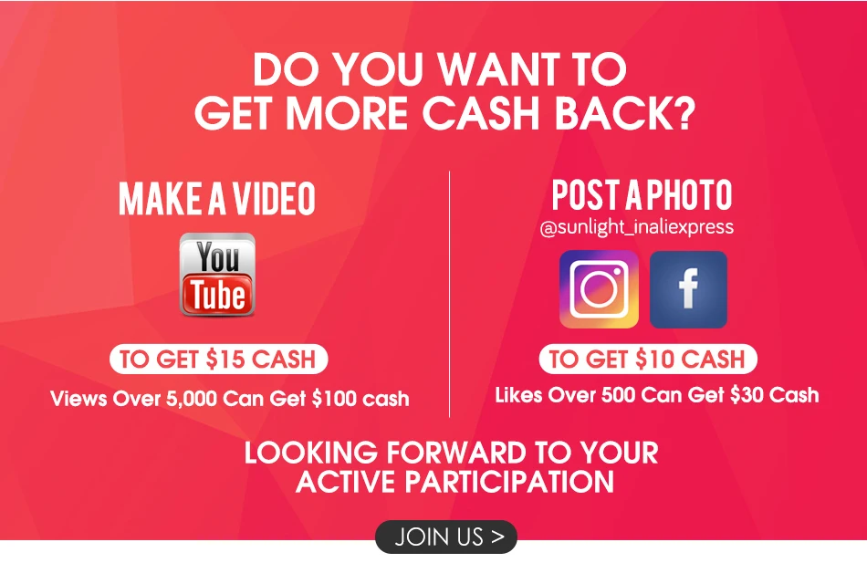 • More Cash Back: Make a Video on YouTube/Post Pictures On Instagram, Facebook @sunlight_inaliexpress